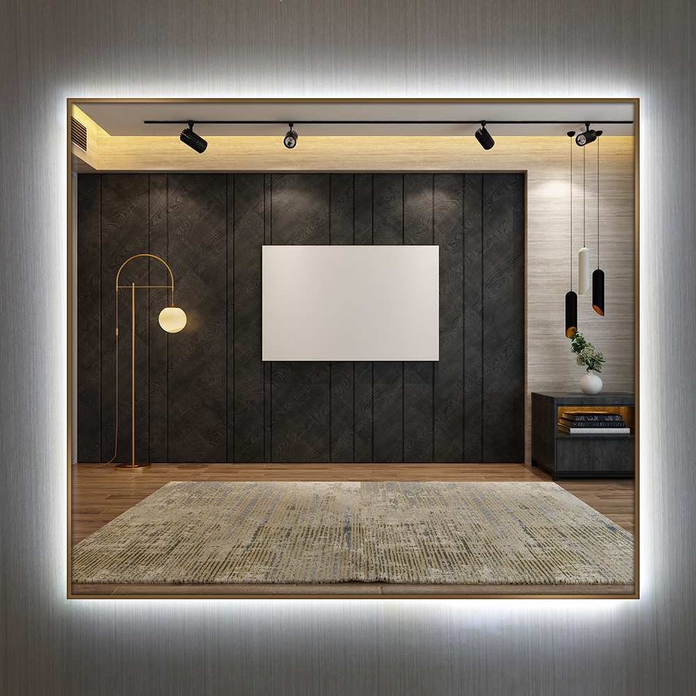 Maison / Produit / Miroir de salle de bain / Miroir de salle de bain rectangulaire / Miroir d'hôtel de miroir de salle de bains léger fixé au mur de modèle différent adapté aux besoins du client